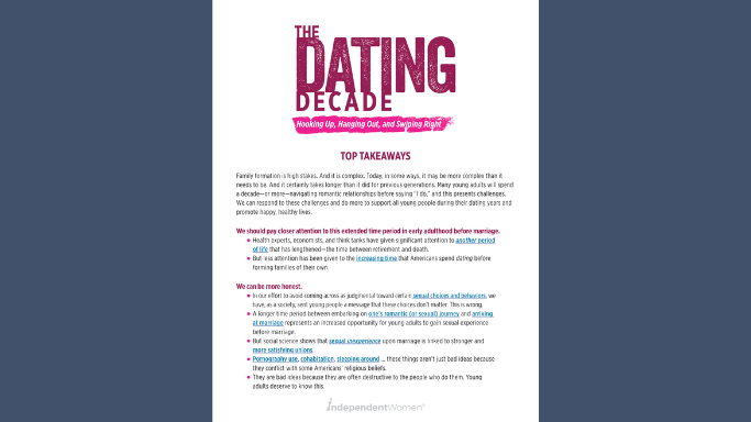This report explores what today’s dating culture looks like, what this means for women, for men, and for our politics and society more broadly. It also presents honest information about how young adults might align their behaviors and choices with their hopes, and avoid (or minimize) wasted time or emotional heartbreak along the way. Further, this report discusses the role of older adults, parents, policymakers, and cultural institutions in creating a healthier environment for future generations to meet and mate.