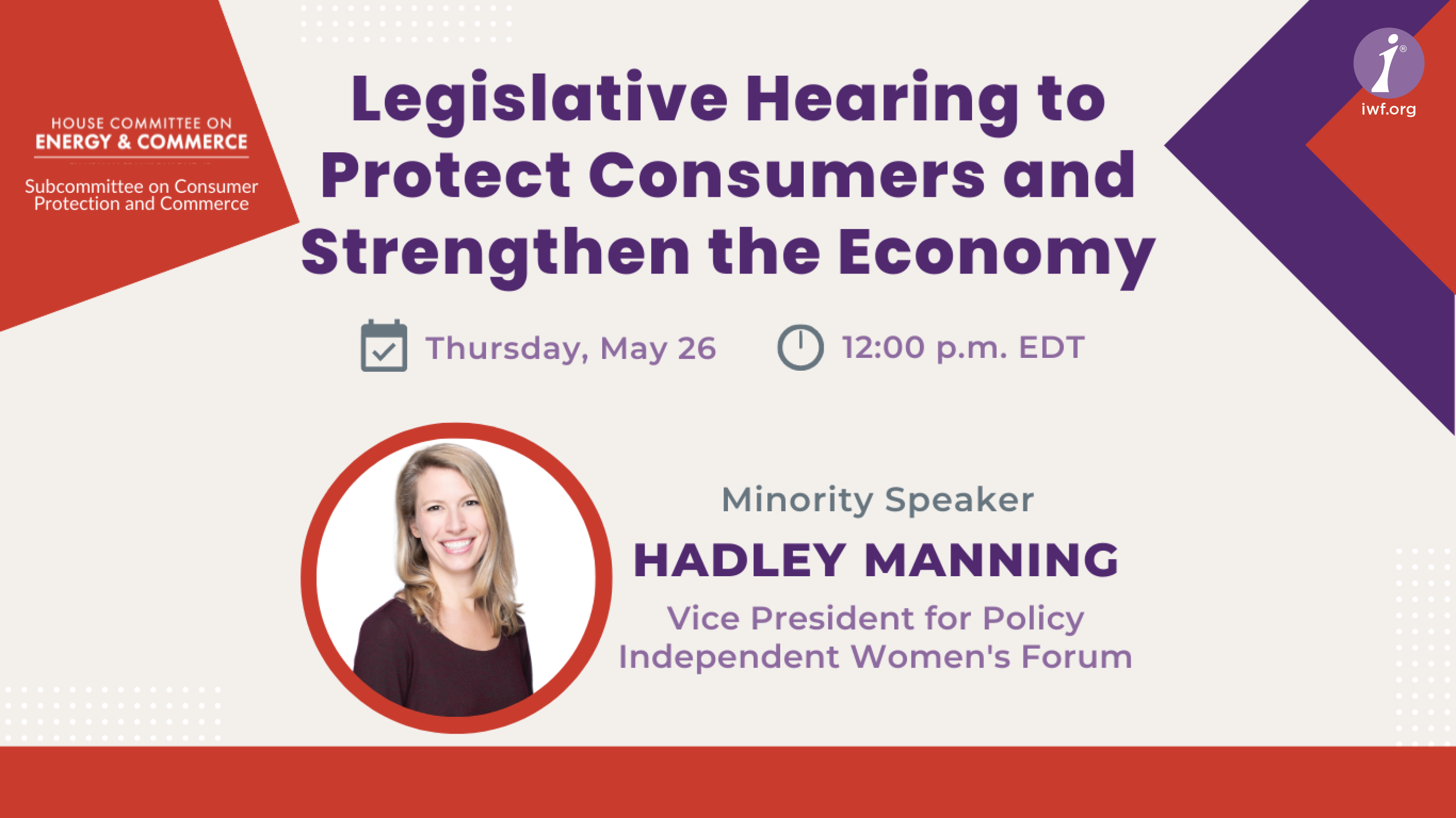 Hadley Heath Manning, IWF’s vice president of policy, testified before the Consumer Protection and Commerce Subcommittee (House Energy and Commerce Committee), on the hybrid “Legislative Hearing to Protect Consumers and Strengthen the Economy.” The hearing took place on Thursday, May 26 at 12 p.m. EDT.