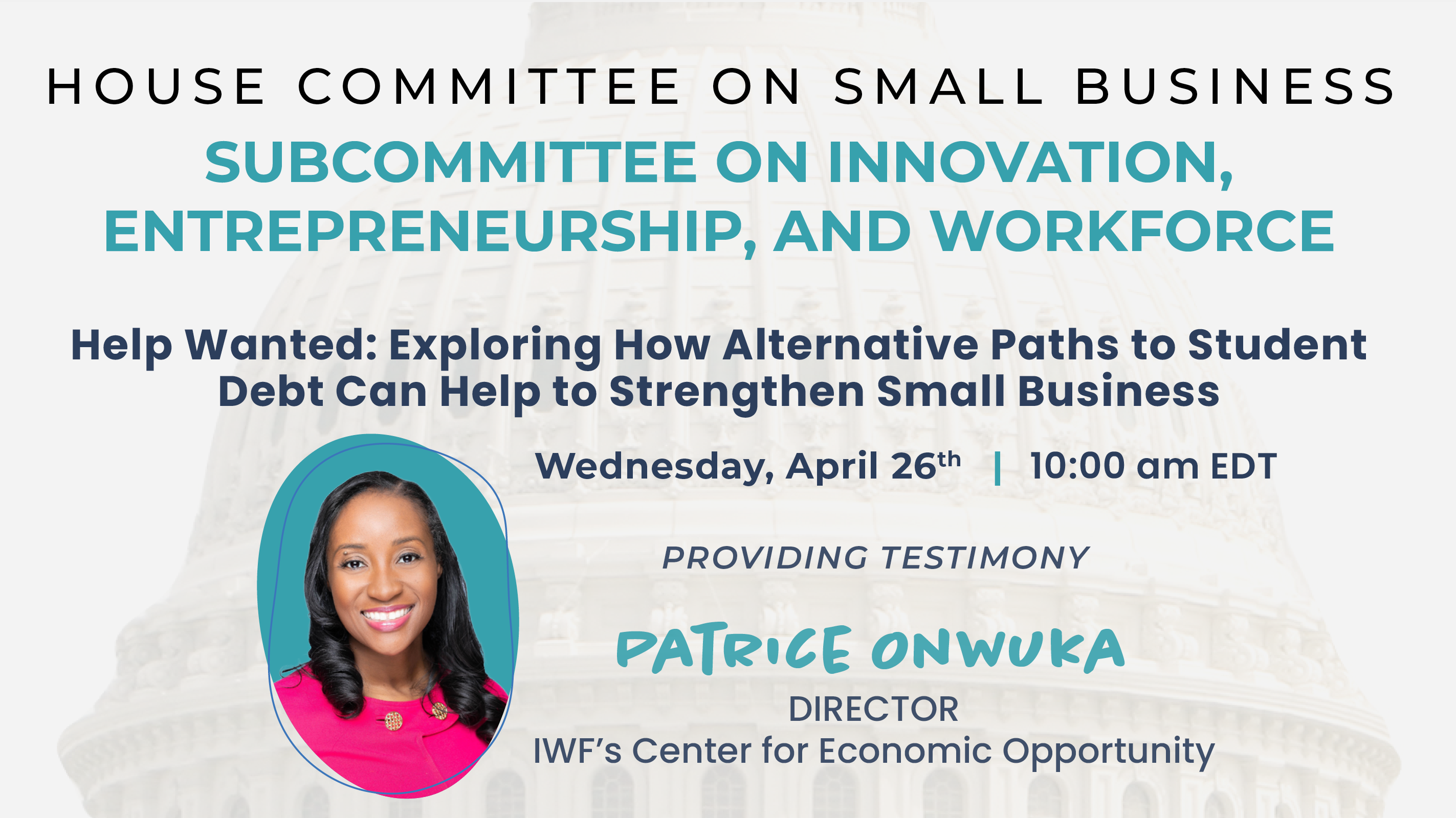WASHINGTON, D.C. — Independent Women’s Forum (IWF) today announced Patrice Onwuka, director of the Center for Economic Opportunity at IWF, will testify before the U.S. House of Representatives Committee on Small Business Subcommittee on Innovation, Entrepreneurship, and Workforce Development at 10:00 a.m. ET tomorrow, April 26, on alternatives to student loan debt.