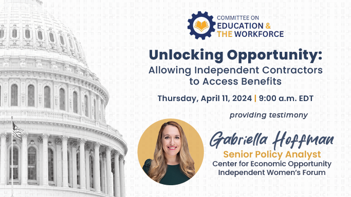 WASHINGTON, D.C. – Independent Women’s Forum (IWF) today announced Gabriella (Gabby) Hoffman, senior policy analyst at IWF’s Center for Economic Opportunity, will testify before the U.S. House Education & the Workforce Committee’s Subcommittee on Workforce Protections on portable benefits for independent contractors at 9:00 a.m. ET on April 11.