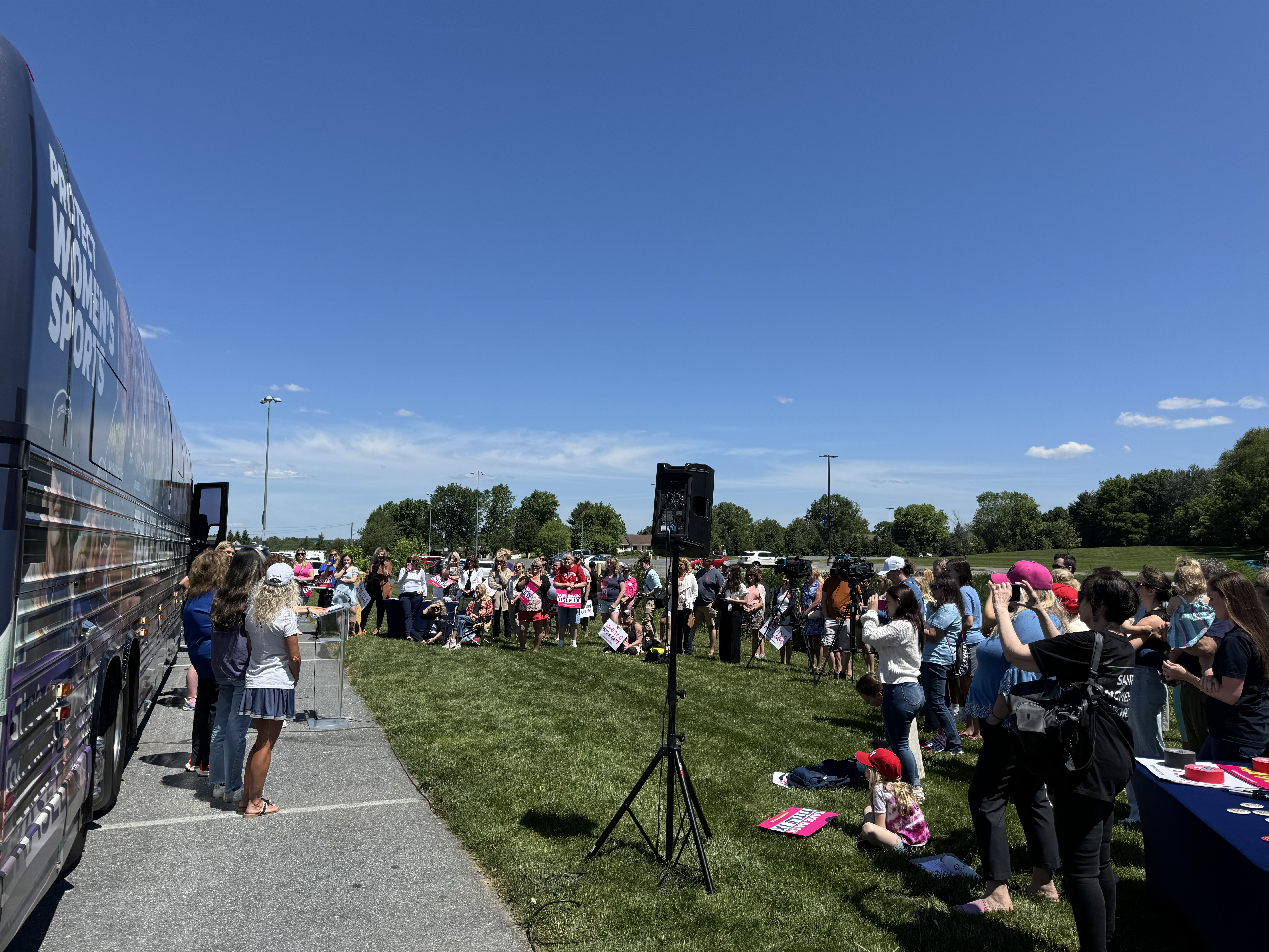 LANCASTER, PA — During the U.S. Women’s Open, professional golfers, coaches, and women’s advocates, held an Our Bodies, Our Sports coalition press conference on Friday to protest Ladies Professional Golf Association (LPGA) and United States Golf Association (USGA) rules allowing male competitors in the women’s category. The event was part of the coalition’s Take Back Title IX Summer 2024 Bus Tour across America, which is calling attention to the devastating impact the Biden administration’s new Title IX regulations will have on women and girls and building upon nationwide momentum to save women’s sports.