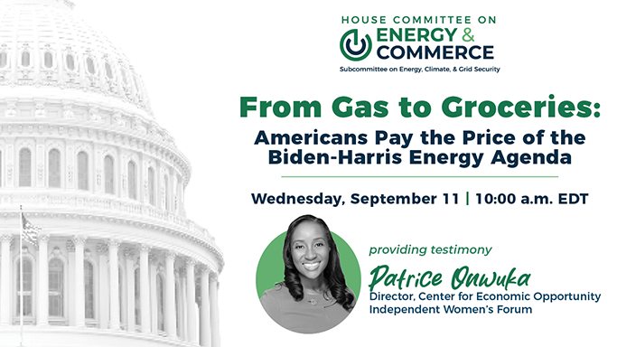 WASHINGTON, D.C. — Independent Women’s Forum (IWF) today announced that Patrice Onwuka, director of the Center for Economic Opportunity at IWF, will testify before the House Energy and Commerce Committee’s Subcommittee on Energy, Climate, & Grid Security on the economic repercussions of the Biden-Harris energy agenda at 10:00 a.m. ET on September 11.