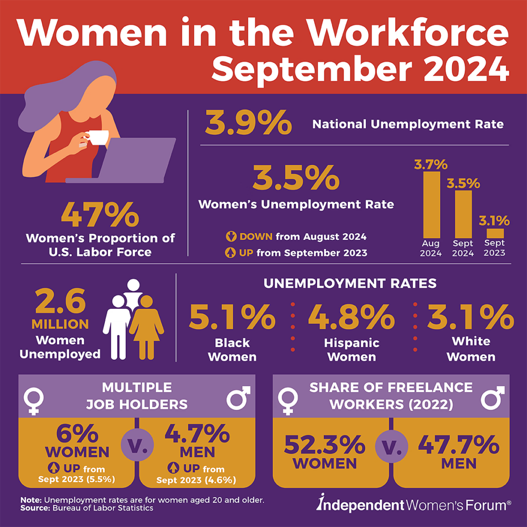 However, statistics are not everything, and significant gaps in the American economy have led more women to take on additional jobs—juggling side hustles to make ends meet. The director of the Center for Economic Opportunity at Independent Women’s Forum, Patrice Onwuka, stated, “Over half a million more workers are holding multiple jobs than at this time last year. Women, even more than men, are taking on additional work or juggling side hustles to make ends meet. Jobs growth feels less positive if Americans are forced to take on a second job just to afford rent, utilities, medicine, and groceries because one job is not enough.”