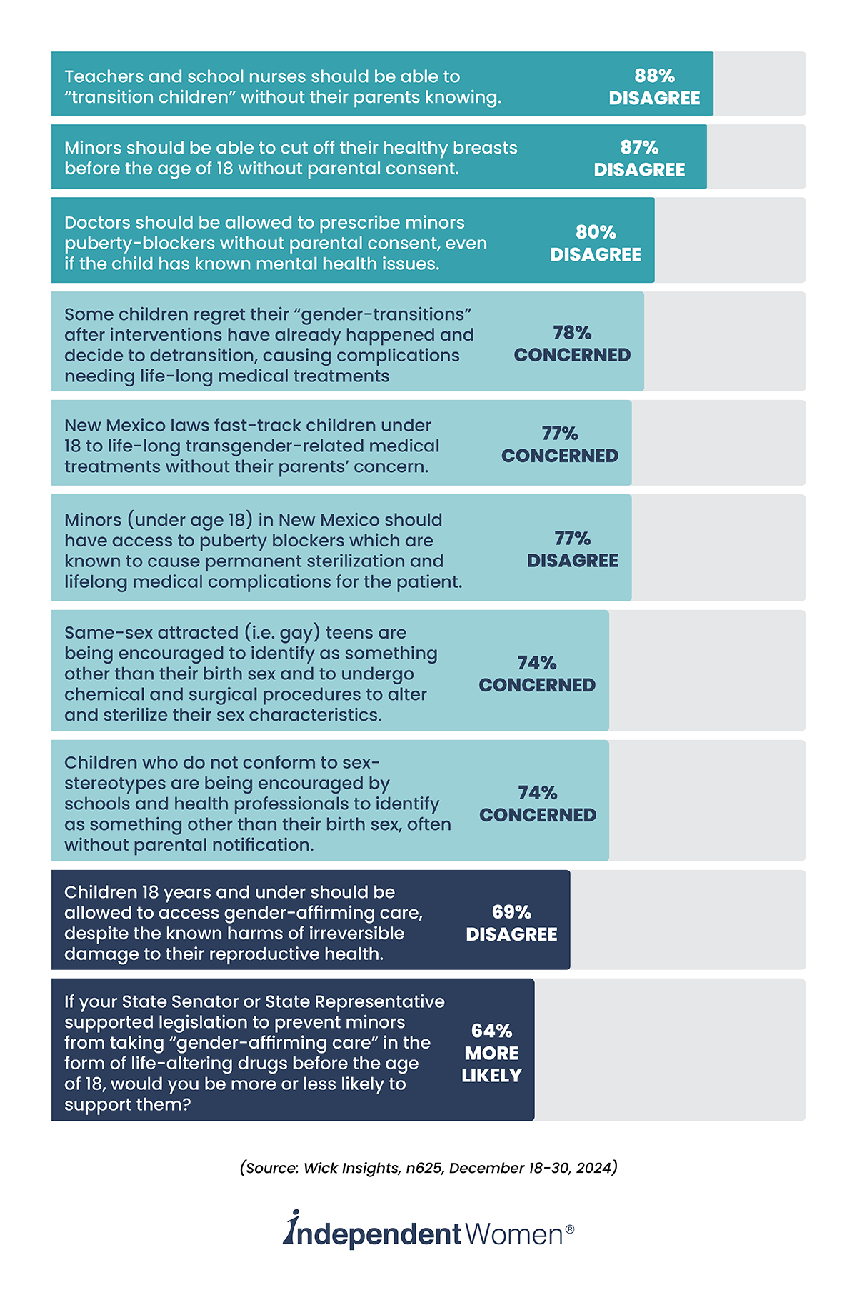 Eighty-eight percent (88%) of New Mexicans disagree with the statement, “Teachers and school nurses should be able to ‘transition children’ without their parents knowing,” and seventy-seven (77%) of New Mexicans answered “concerned” when told that, “New Mexico laws fast-track children under 18 to life-long transgender-related medical treatments without their parents’ concern.”