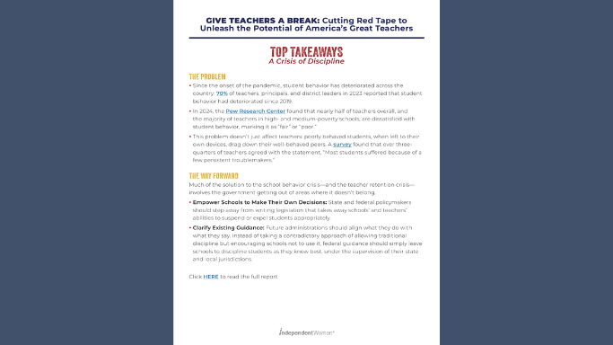 The Give Teachers a Break report examines how rapidly declining test scores, childhood illiteracy and innumeracy, classroom disarray, and low rates of teacher retention are considered failures of American education policy and are often attributed to teachers themselves. But what often goes unacknowledged is the fact that teachers’ hands are tied: the sheer amount of red tape they are forced to navigate makes teaching more difficult than it needs to be and less effective and less rewarding than it should be.